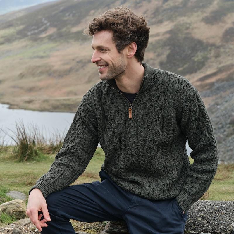 Men’s Half-zip Aran Sweater | 100% Merino Wool | Traditional Irish Knit | Army Green