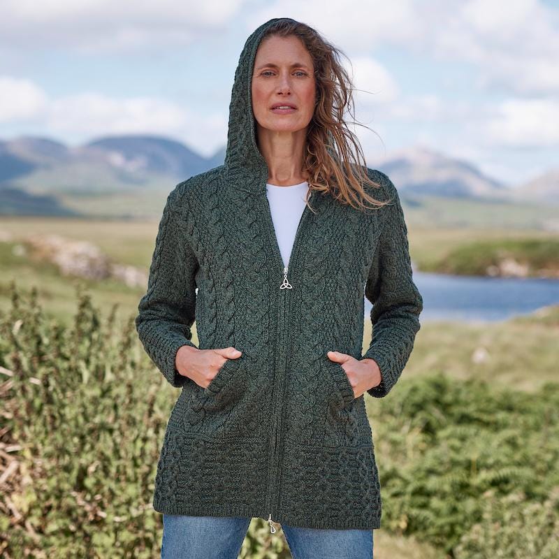 Merino Wool Hooded Aran Coat: Army Green Celtic Knit