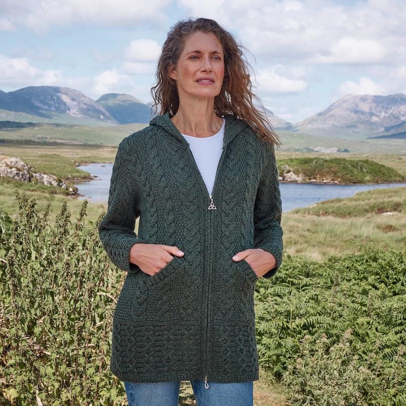 Be the first to review “Merino Wool Hooded Aran Coat: Army Green Celtic Knit” Cancel reply
