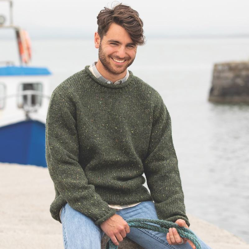 Traditional Irish Fisherman Wool Sweater: Flecked Green Yarn, Unisex Fit